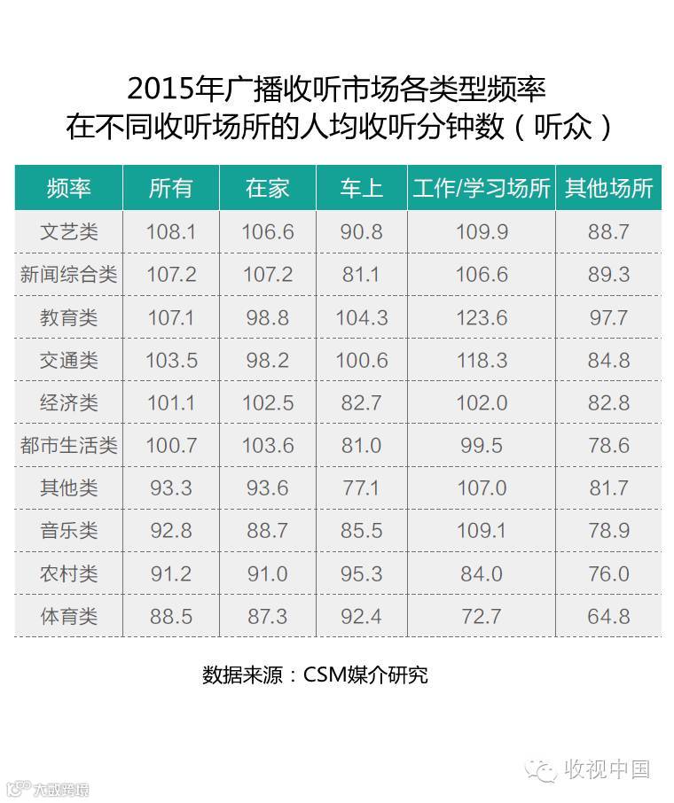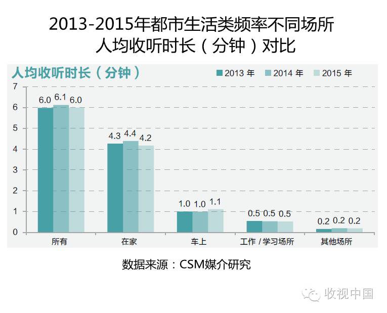 听众在所有场所收听都市生活类频率的时长自2013年以来呈逐年递减趋势,人均每日收听时长从2013年的6.5分钟,下降至2014年的6.4分钟,在2015年更是进一步缩减为6分钟,三年来的降幅达7.7%。