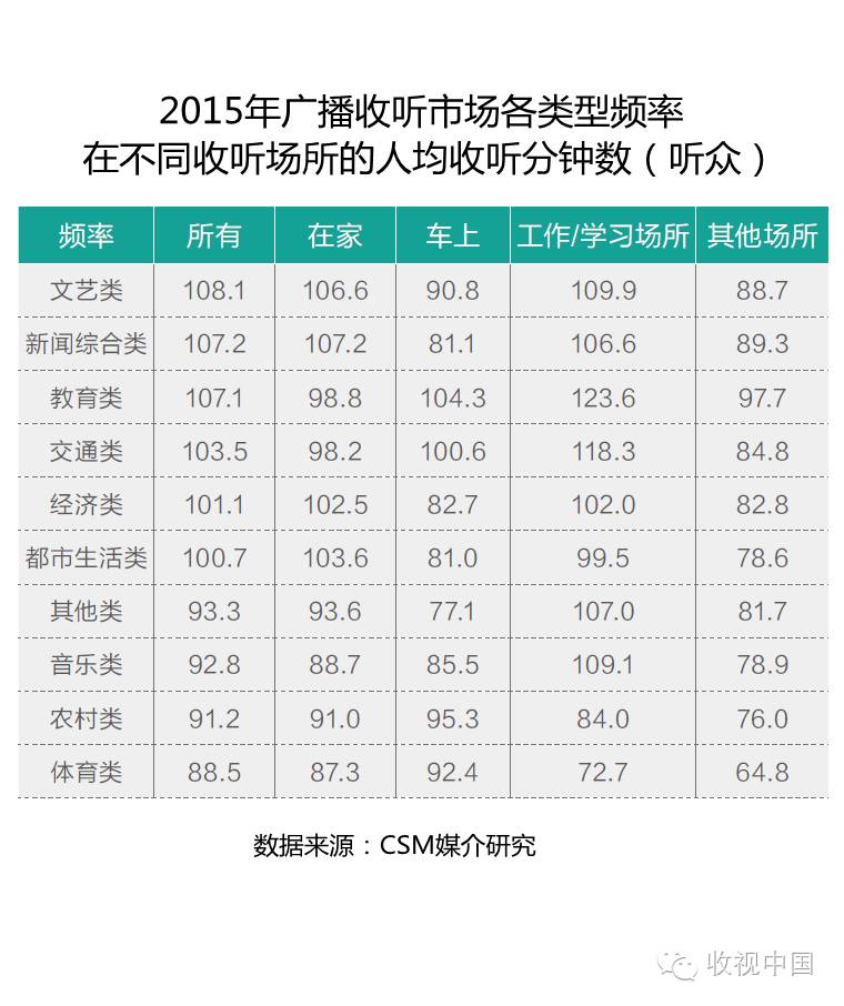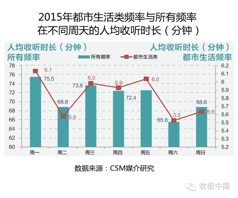 从2015年所有频率在所有场所不同周天的人均收听时长来看,周一的收听量最大,人均收听75.5分钟,其次为周三、周五和周四;受部分广播电台停机检修影响,周二的收听量出现明显下降,人均收听时长仅为68.8分钟;周末收听量略低于工作日。