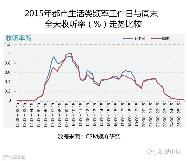 2015年都市生活类频率工作日与周末全天收听率走势基本相似,全天呈现多个收听高峰,以早间时段收听效果最好。工作日的收听率在早间6:00-9:00时段、午间11:15-14:00时段和傍晚17:00-22:00时段均明显高于休息日;而在上午8:45-11:00时段和下午14:00-16:45时段,休息日的收听率则较工作日有一定提升,听众在周末收听广播的时间选择更为灵活,不仅仅是局限于早晚上下班的时段。