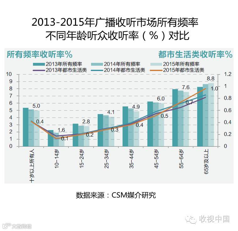 都市生活类频率各年龄层听众的收听率差异与整体广播收听市场所有频率的收听现状基本相似,也呈现出老年听众收听量稳步增长的趋势,但从听众年龄层来看,相对所有频率更加年轻,为55岁及以上人群;另外,10-14岁青少年在2015年的收听率虽不及2013年同期,但较2014年也有一定增长。