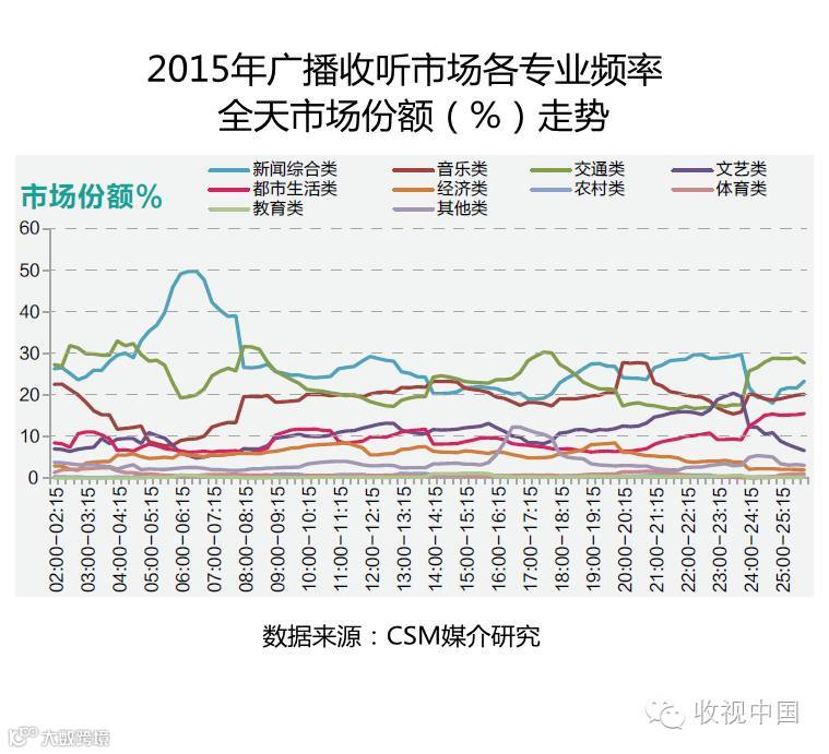 新闻综合类频率在早间时段市场份额一枝独秀,竞争实力雄厚;交通类在早晚上下班时段竞争力较为突出,音乐类频率在晚间20:00-21:00时段竞争实力不容小觑;其余类型频率与都市生活类广播频率的全天走势基本趋同,竞争实力较为均衡。