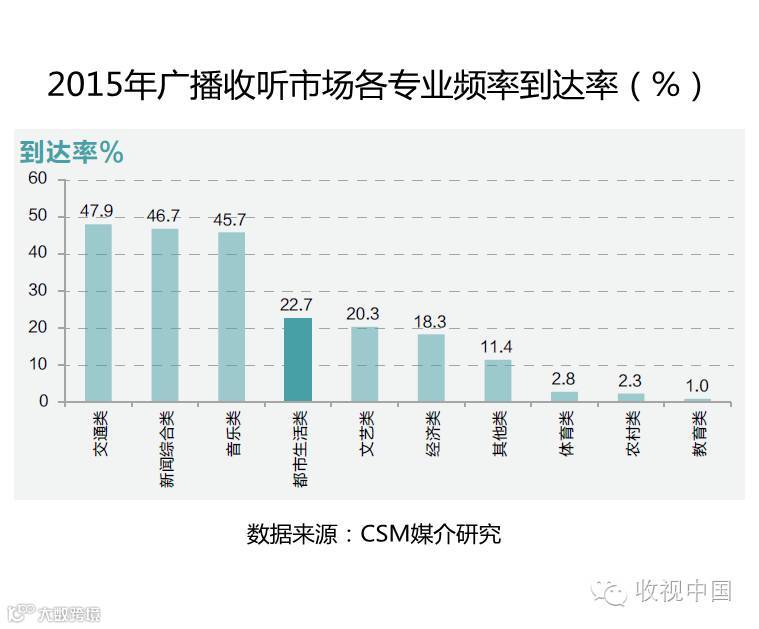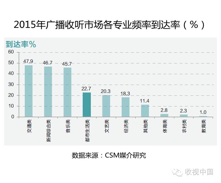 都市生活类频率听众规模处于第二阵营首位,其播出节目内容广泛,吸引较多听众关注,以22.7%的到达率引领文艺类频率和经济类频率占据了整体市场的中间位置;而专业频率中的体育类、农村类和教育类频率则较为小众,听众规模较小。