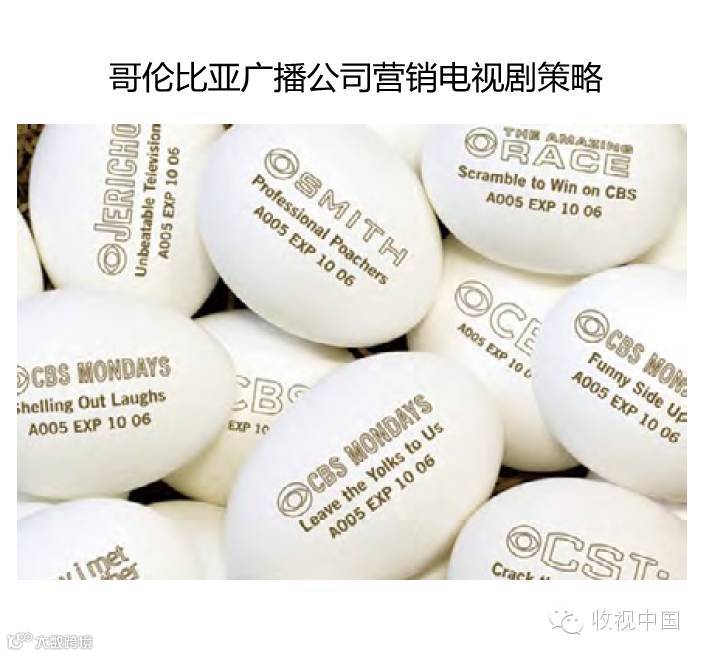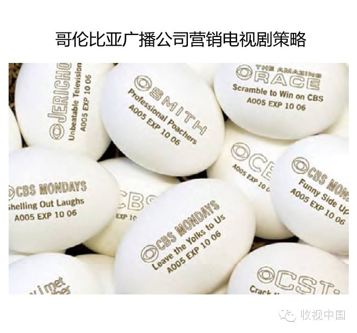 例如美国哥伦比亚广播公司,几年前为了宣传电视剧,在夏季的时候就把秋季要播的电视剧印在鸡蛋上,在超市售卖。CBS的目标观众年龄较大且以女性居多,因而营销人员选择这种夺眼球的做法。此外,增加观众和电视内容的互动,对年轻人尤为重要。