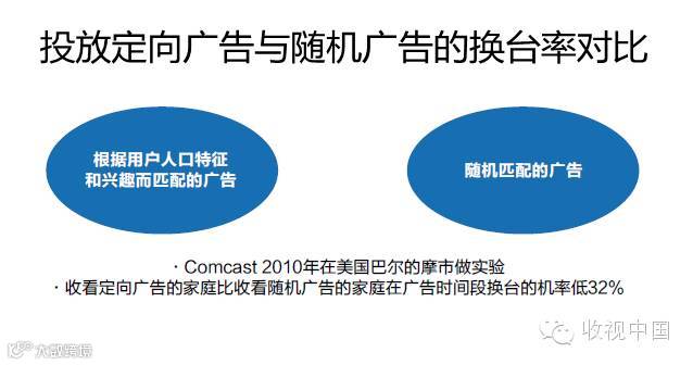 电视广告面临着很大的挑战,观众为什么跳过广告?可能很重要的原因是与观众的兴趣无关,例如狗粮的广告,某些观众或许根本就没养宠物。Comcast2010年在美国巴尔的摩市做实验,参与实验者分为两组,第一组人根据用户人口特征和兴趣而匹配的广告,另一组人随机匹配广告。