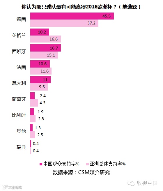 研究显示,45.5%的中国体育观众认为德国队将夺得最终的冠军,支持率远远超过其它球队。排名第二的西班牙队仅有16.7%的受访者支持,第三至第五名的支持率非常接近,分别是老牌劲旅意大利(11.0%),东道主法国队(10.6%)和英格兰队(10.2%)。