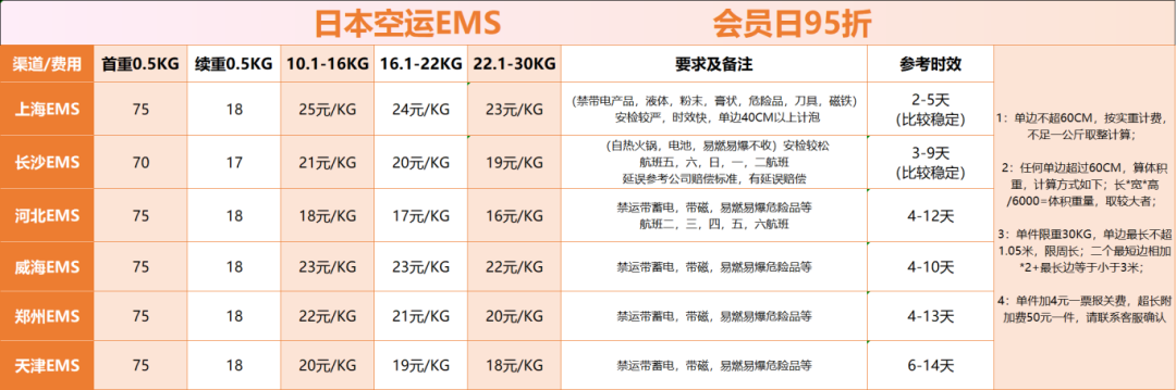 别担心!我们为你整理了一份超值日本寄送价格表,涵盖EMS空运、海运超大件、佐川小包等多种渠道,价格低到想不到,会员日还能再享95折! 快来一起薅羊毛吧!