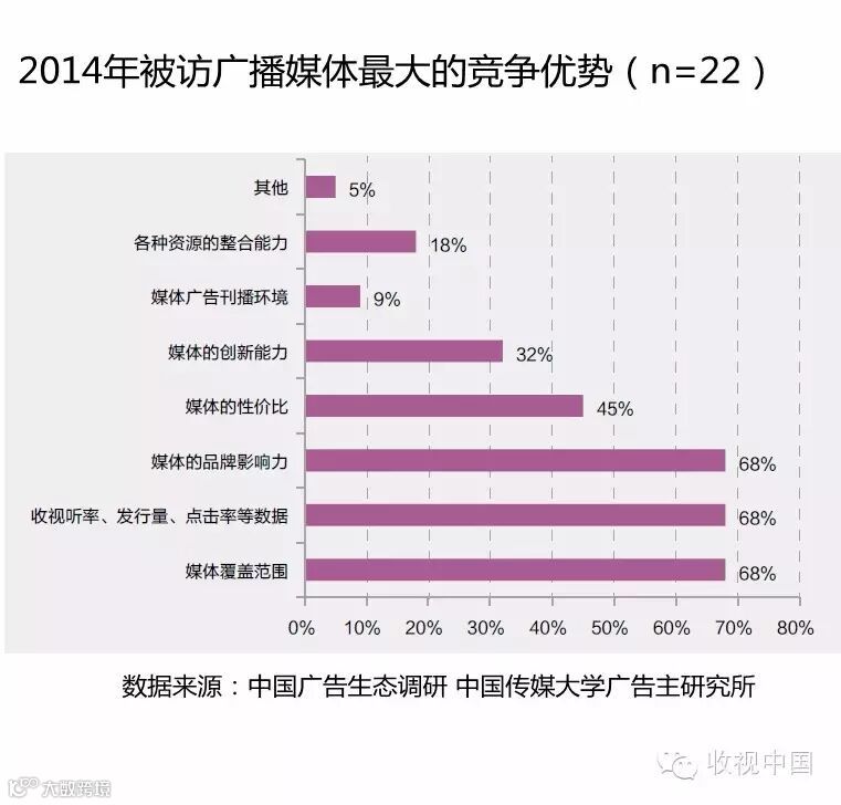 广播媒体来自手机、户外等数字媒体的竞争压力陡升。2014年,六成的被访广播媒体认为手机、数字户外等数字媒体是广告经营主要的竞争压力来源,位居第一。比上一年增长了一倍。再次,才是广播和户外。网络电台在抢夺传统广播的市场份额,主流的移动网络电台已经纷纷完成了融资。