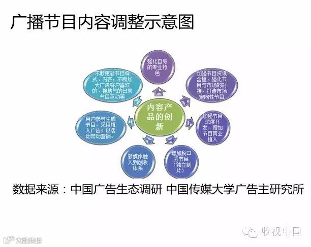 中国传媒大学广告主研究所2014年-2015年广告业生态调研结果显示,围绕内容经营适时调整,产品创新多样化,被访广播媒体节目/栏目等媒体内容的调整主要有以下几方面: