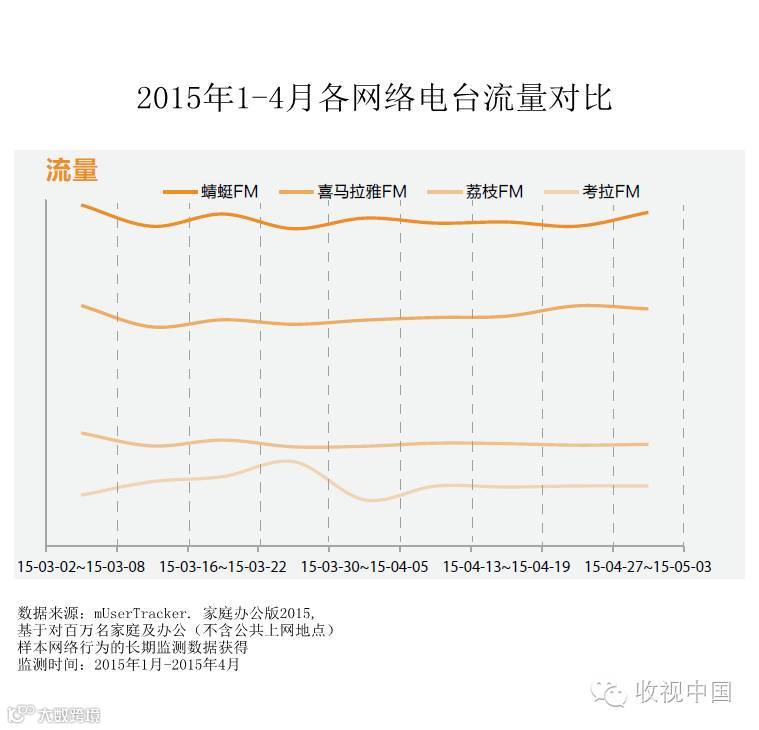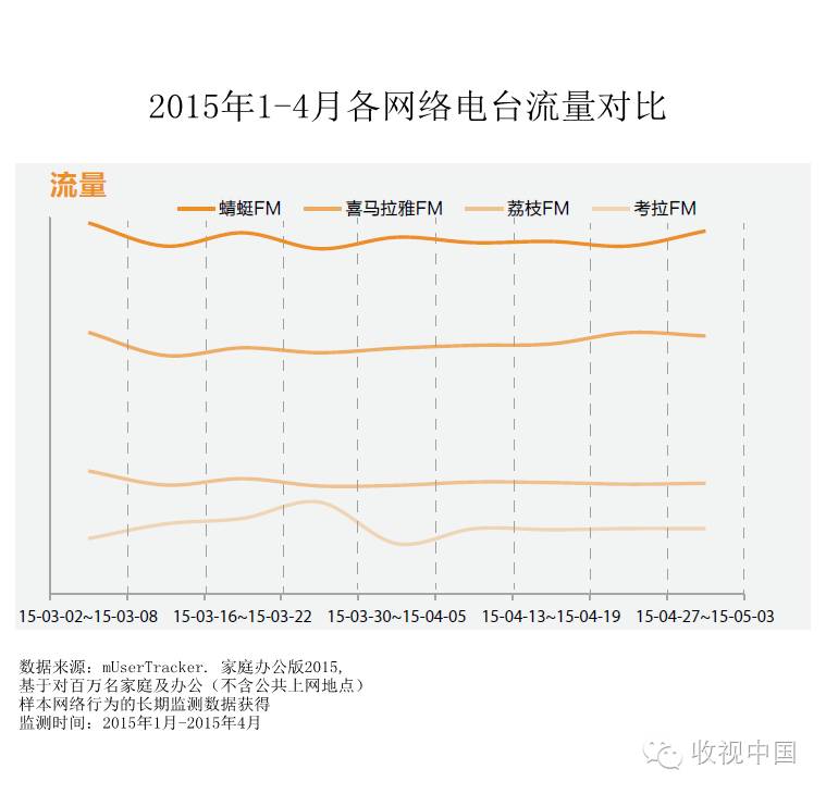 2015年1-4月各网络电台流量对比显示,第一阵营的蜻蜓FM、喜马拉雅FM、荔枝FM、考拉FM表现都相当不错。网络电台APP流量分化较明显,流量总体较稳定。