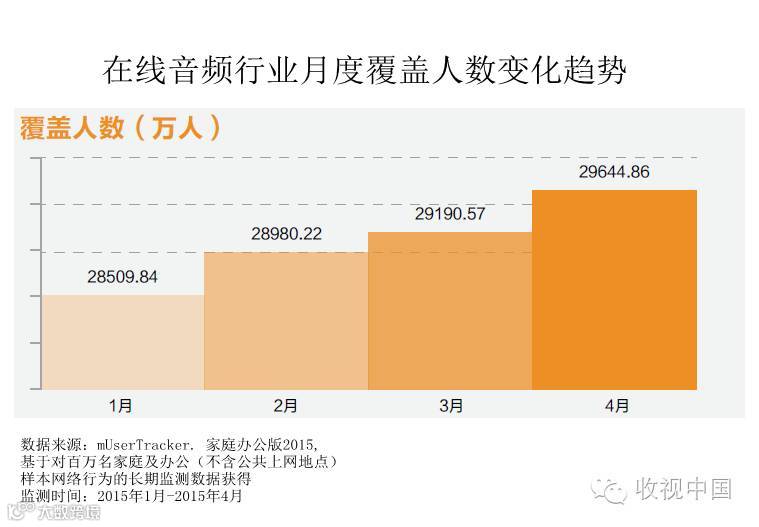 随着发展的深入,这样的例子未来只会越来越多。在线音频行业月度覆盖人数趋势显示,现在每个月有近3亿的人会每月至少用一次音频的产品收听。收听需求导致音频市场的爆发,用户覆盖增长快,上升潜力大。