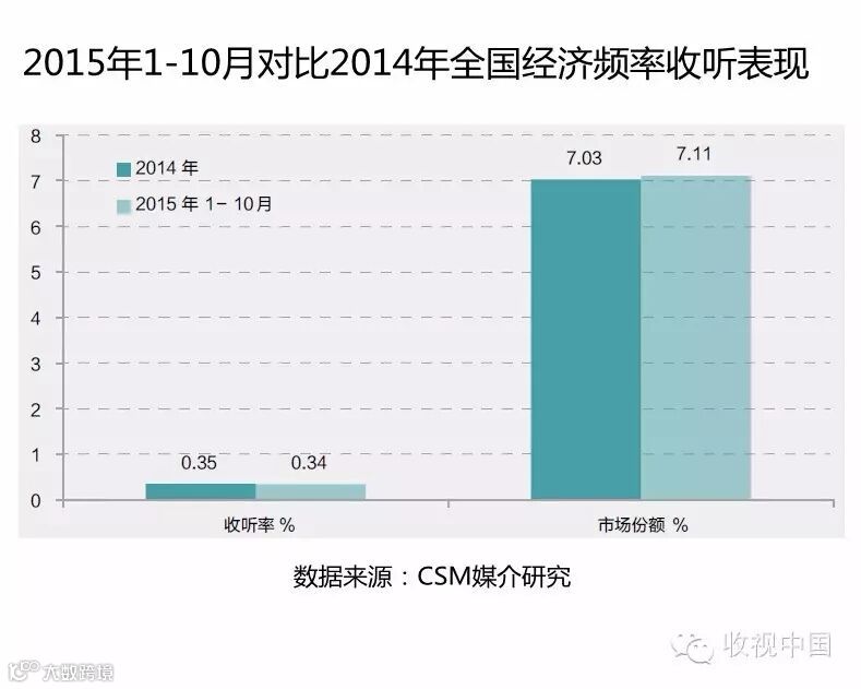 2014年与2015年1-10月的市场份额分别为7.03%和7.11%。这与多数经济频率财经类节目较少,且节目质量参差不齐存在一定的关系。