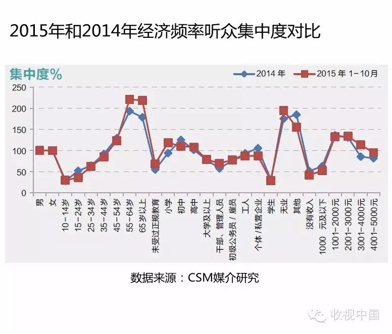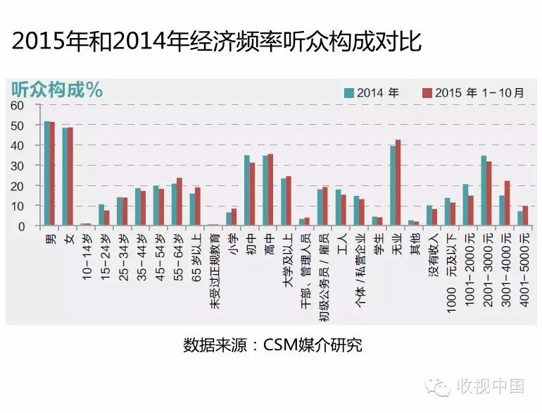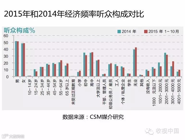 2015年1-10月相比2014年听众比例,不论是55岁及以上中老年、无业人群,还是高中、大学及以上、初级公务员/雇员、高收入人群听众比例及对经济频率的偏好度均有不同幅度的增加。从以上的数据可以看出,股民的迅速增加,对经济频率的听众群体范围的扩大存在影响。
