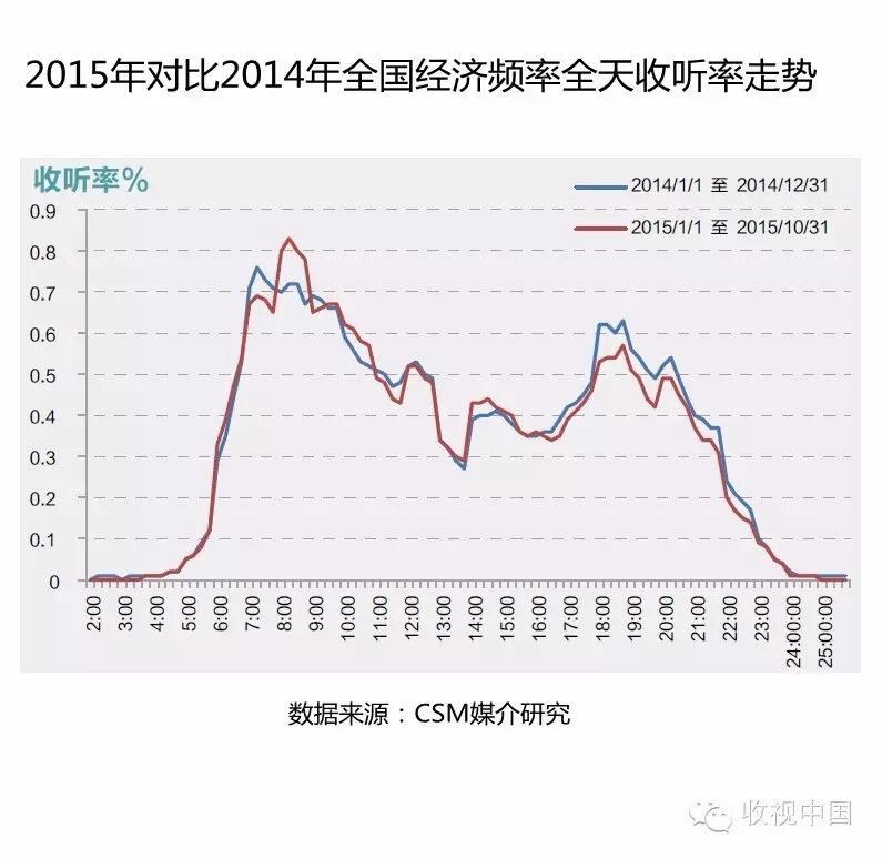 由于2015年股市震荡厉害,在早间08:00-09:00的出行时段,上午09:30-11:00、下午14:00-15:00股市交易时段,2015年的收听率略高于2014年同时段。