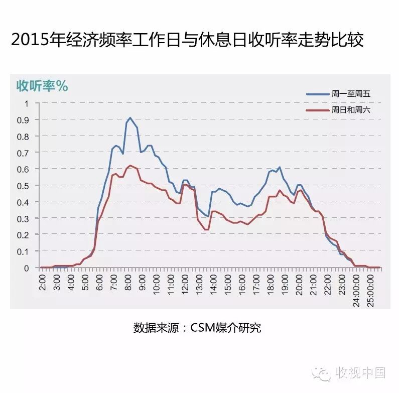 从2015年1-10月经济频率工作日与休息日收听率走势比较图来看,工作日和休息日全天整体走势基本相似,但休息日全天收听走势相对平稳,收听高峰明显低于工作日。