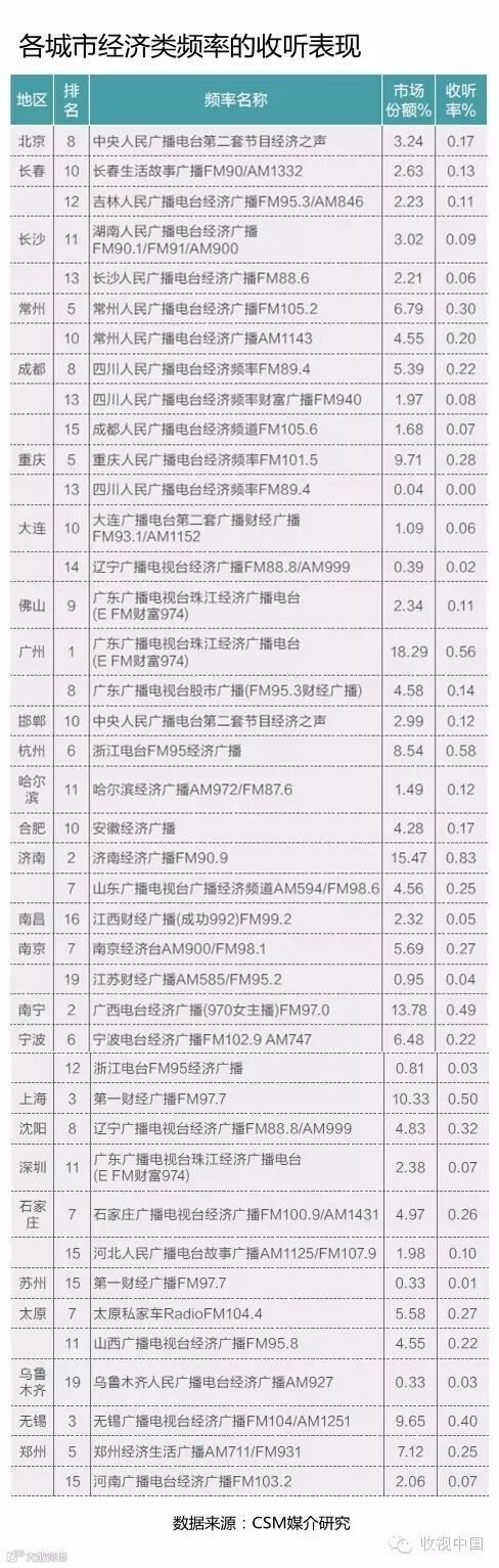 济南地区的济南经济广播FM90.9和南宁地区的广西电台经济广播(970女主播)FM97.0位居第二。