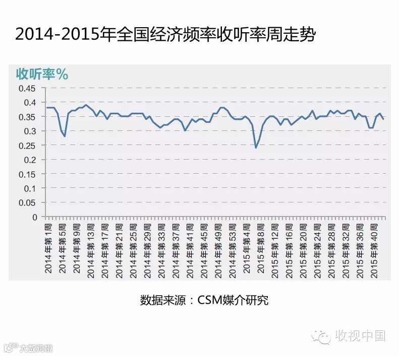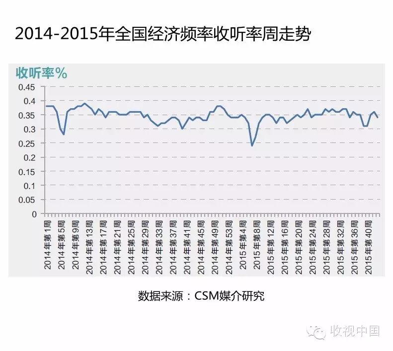 通过观察2014年至2015年全国经济频率收听率周走势,可以清晰看到全国经济频率收听表现平稳,并未受到股市大幅震荡的影响,收听率维持在0.35%左右,并且市场竞争力也稳定。