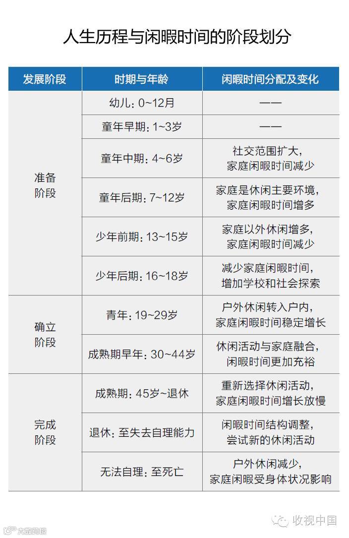 如上所分析,电视收视行为,归根结底是一种对闲暇时间的消费。对于本文所研究的处于特定年龄阶段的受众,可以从人生历程这一角度切入对闲暇时间媒体消费的研究。约翰·凯利将当代社会的人生历程分为三个生物-社会阶段:准备阶段、确立阶段和完成阶段。