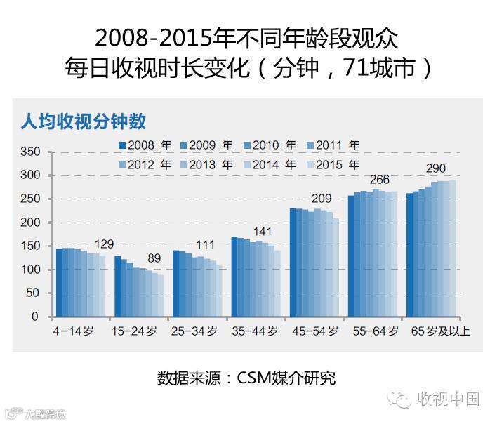 可以看出,伴随着以互联网为代表的新媒体发展的风生水起,传统媒体影响力式微,在其影响下年轻一代受众成为更易于脱离传统走向新媒介的群体。根据CSM媒介研究近年来对各年龄段观众收视行为的持续观察,我们也发现,在老年收视群体的收视趋于“滞胀”的同时,45岁以下相对年轻群体的收视量却呈现出明显的逐年下滑趋势,尤其是15-24岁的青少年群体,收视下滑的速度更快,全天收视时长从2008年的129分钟降至2015年的89分钟。