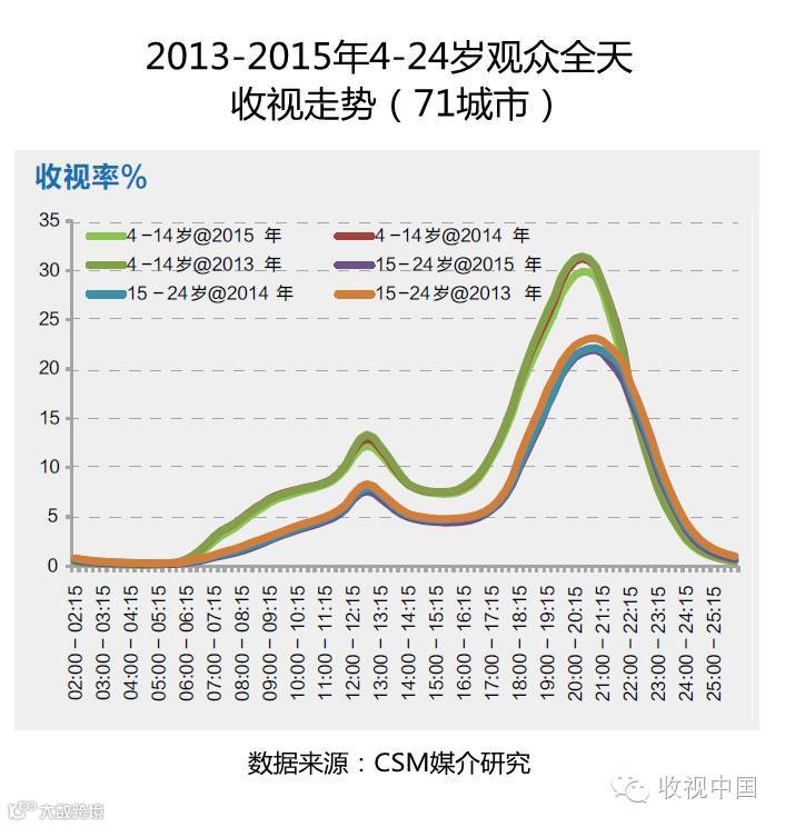 追踪到全天不同时段的收视中,可以看出4-14岁较低年龄段的观众,2015年收视下滑明显,且下滑集中于午间和晚间黄金时段;15-24岁的受众,收视下滑主要出现在2014年,在晚间黄金时段收视下降相对明显。