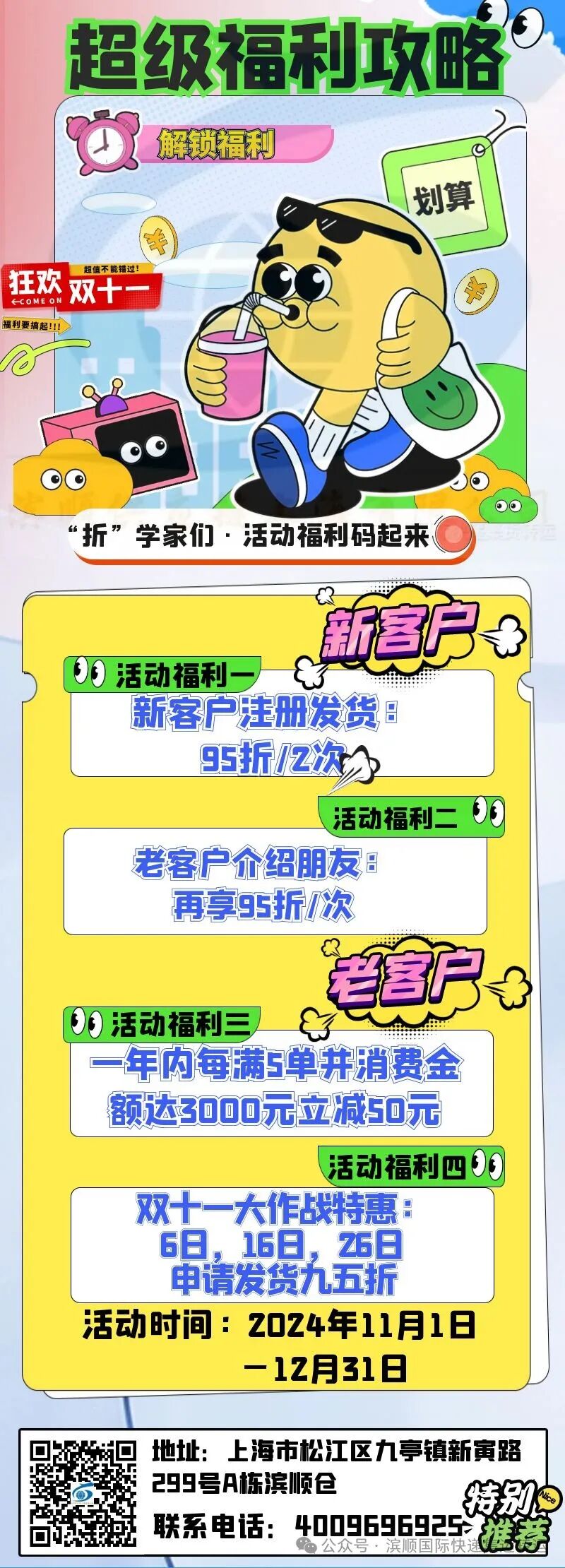 滨顺国际快递集运转运新增活动,11月--12月的6日,16日,26日为我司的活动日,所有在这三天申请发货的客户统一九五折,以申请出货的系统时间(北京时间)为准,活动一.新客户注册发货送二次九五折。