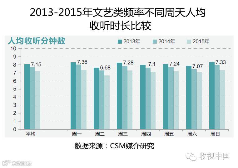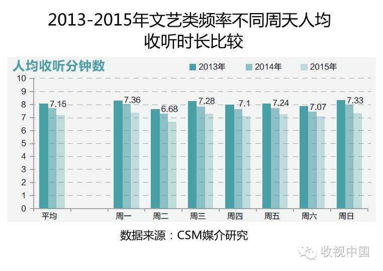 文艺类频率在2015年的人均收听时长为7.15分钟,相比2014年减少了0.54分钟,未能停止跌势。从不同周天的收听走势来看,周一、周三、周五和周日收听时长相对较高,各周天之间收听时长差异不大,与前两年的走势相似,但各周天的收听时长均有不同程度的下跌。
