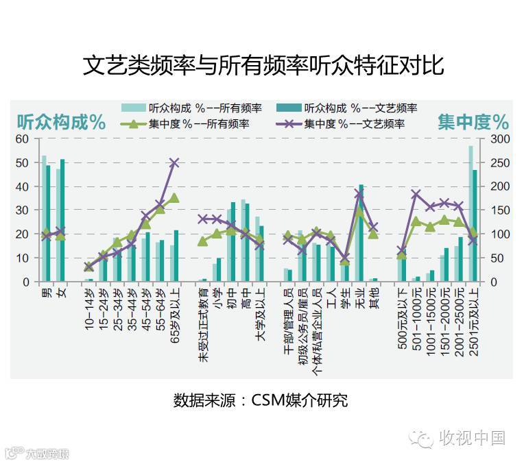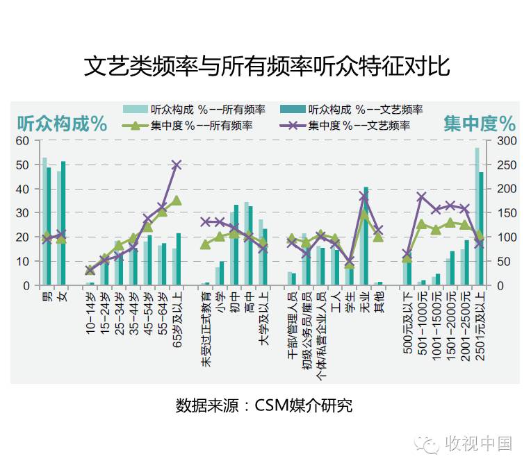 文艺类频率的听众主要以女性、35岁及以上、中等学历和无业人群为主,与收听市场整体听众相比,在性别上有所差异。文艺类频率的重度听众为女性、45岁及以上、中低学历和个体/私营企业人员和无业等群体,相比整体市场,除性别的差异外,老年听众的集中度更高,学历上更偏向于低学历人群,而职业类别上则较为贴近。