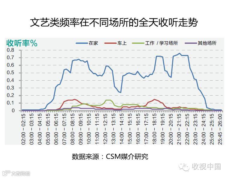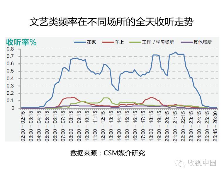 听众主要“在家”收听文艺类频率,因而从全天收听走势来看,“在家”各时段远高于其他场所,并在07:00-10:30、12:00-13:00、17:45-19:30和20:00-22:15时段出现明显的收听高峰,但13:00-14:00的低谷时段也较为突出,“车上”则是上下班高峰时段07:00-09:00和17:00-18:45表现较好,“工作/学习场所”的听众主要在11:45-13:00收听文艺类频率,相比之下,“其他场所”收听走势较为平缓。