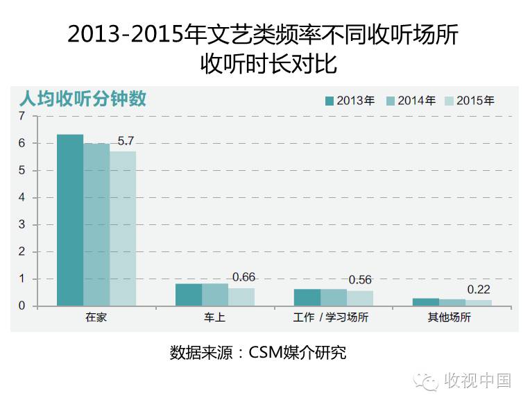 听众主要“在家”收听文艺类频率,收听时长为5.7分钟,相比2014年下跌了0.29分钟,占总下跌分钟数的五成以上,听众在“车上”、“工作/学习场所”和“其他场所”人均收听文艺类频率时长较短,且均有不同程度的下跌。