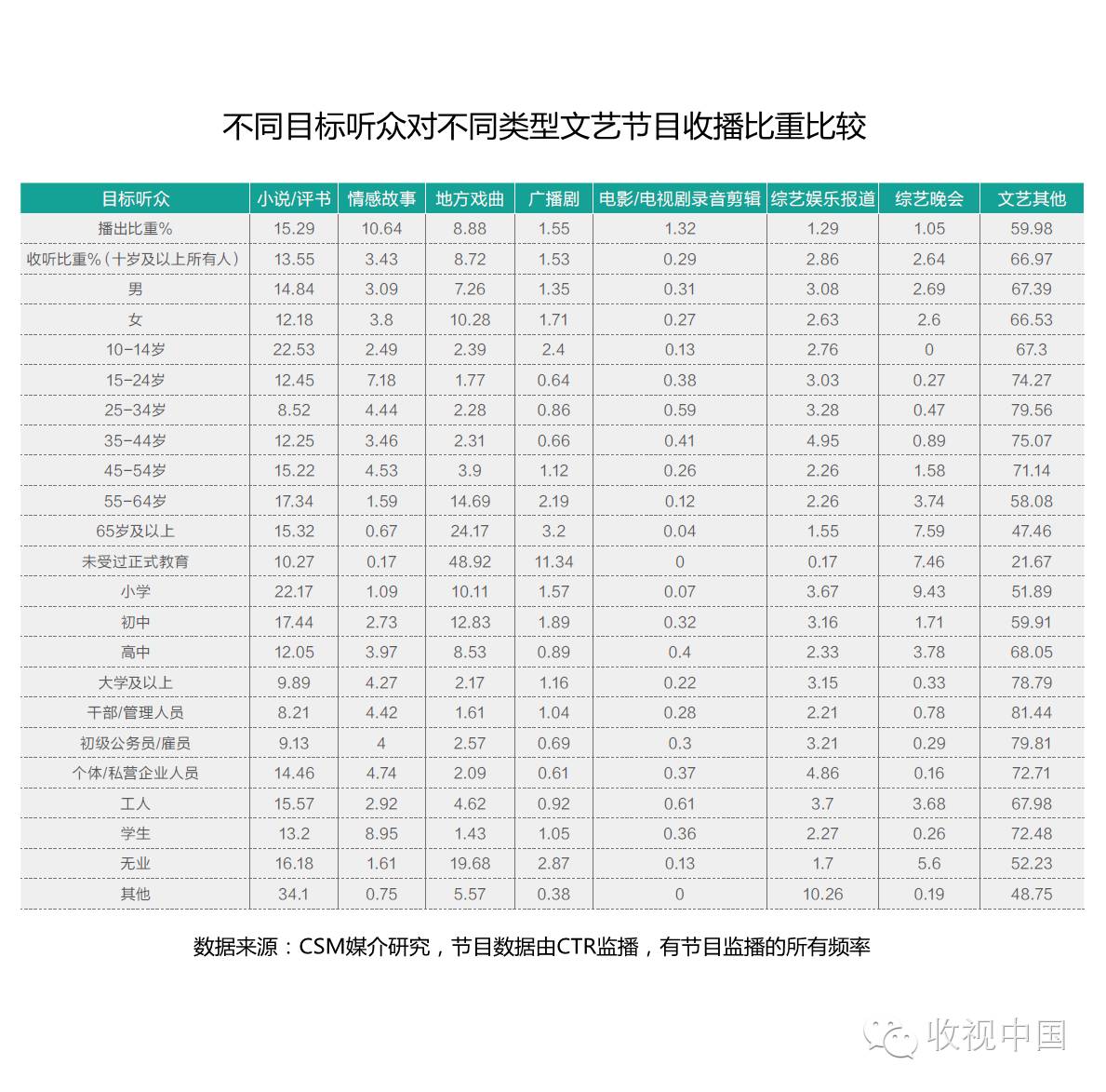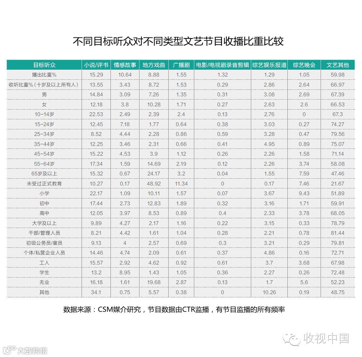 在受教育程度方面,随着听众学历程度的上升,收听小说/评书、地方戏曲、广播剧和综艺晚会的时长比例下降,文艺其他收听比重有所上升,综艺娱乐报道则相对平均,未受过正式教育的听众花了接近一半时间收听地方戏曲。