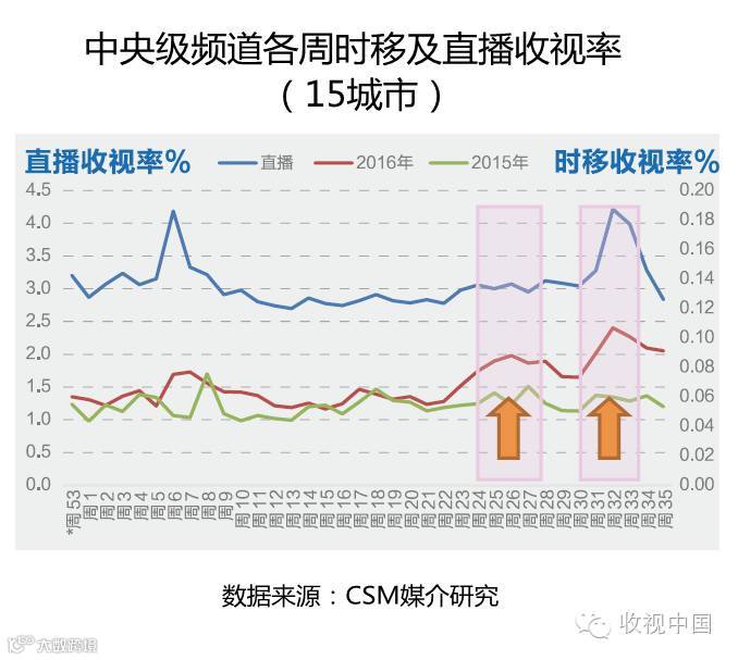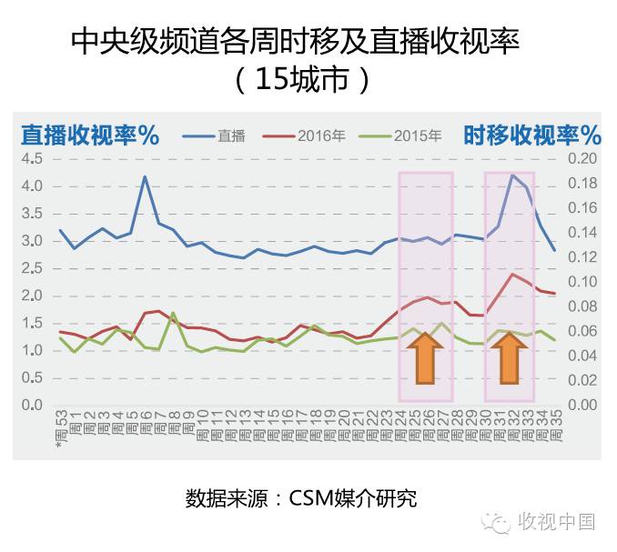 6月10日至7月10日的法国欧洲杯期间以及8月6日-8月22日的第31届奥运会期间,中央级频道的直播及时移收视明显提升,时移收视率与去年同期相比最大周增幅达到78%,对直播收视影响的重要事件,对时移收视也会造成较大的影响。
