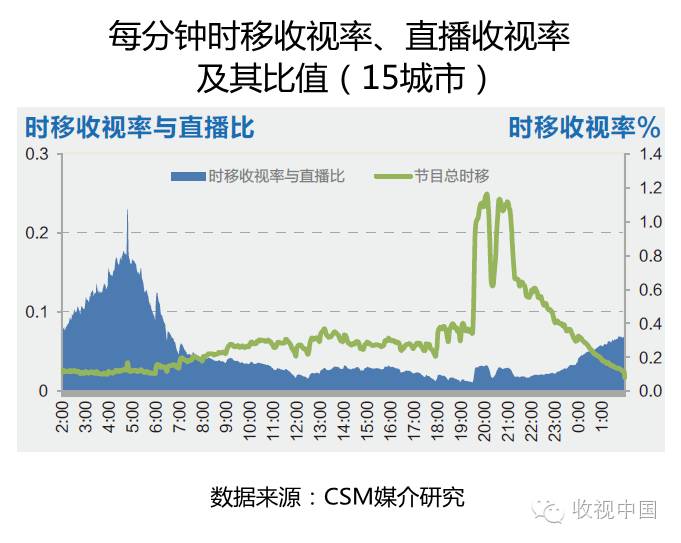 此后的21:20-23:00的时段也是观众主要回看的节目时段,各大综艺节目常在这个时段播出,带动了此时段节目的时移收视。从全天节目时移收视与直播收视的比值可以看到,晚间23:00到早上7:00,时移收视对直播收视的提升显著,4:23前后比值最高达到23%左右。白天到晚间23:00之间,时移收视对直播收视的提升比例波动不大。深夜及凌晨时段播出的节目通过时移收视进一步提升其总体收视水平。