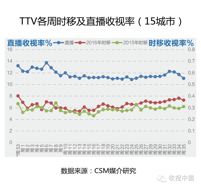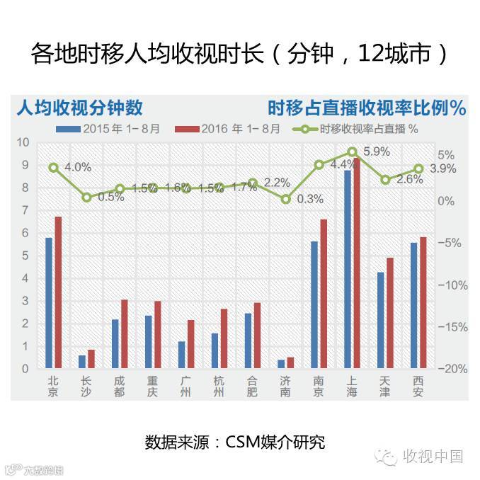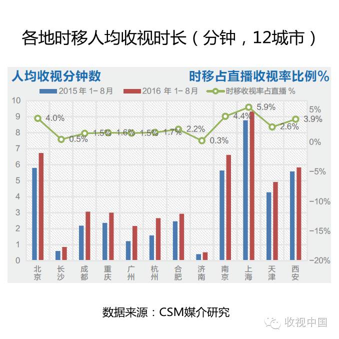 在所有观众中,平均每周发生时移收视的观众占16%,拥有回看设备的观众时移观众达到35%;2016年1至8月与去年同期相比,各地时移人均收视时长都有了显著增长,但各地水平差异较大,随着回看设备的普及,互动服务的进一步提供,时移收视具有相当大的增长空间。