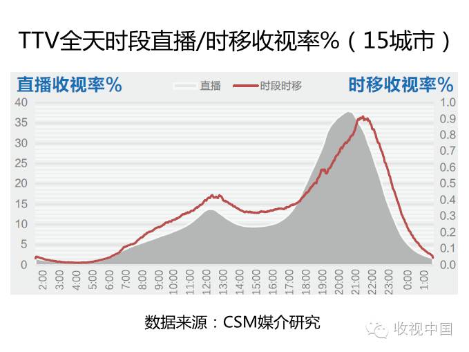 观察全天节目时移的特点可以看到,每天晚间的新闻联播结束后的19:30-20:10时段以及20:35-21:15时段是观众主要回看的节目时段,此期间主要播出的是各大卫视晚间播出的2集电视剧,由于通常回看节目时会跳过其中的广告部分,因此图中可以明显的观察到两集电视剧中的广告时段时移收视瞬间降低,而直播曲线则仍然保持高位,这也与时移主动选择节目内容的行为特点相一致。