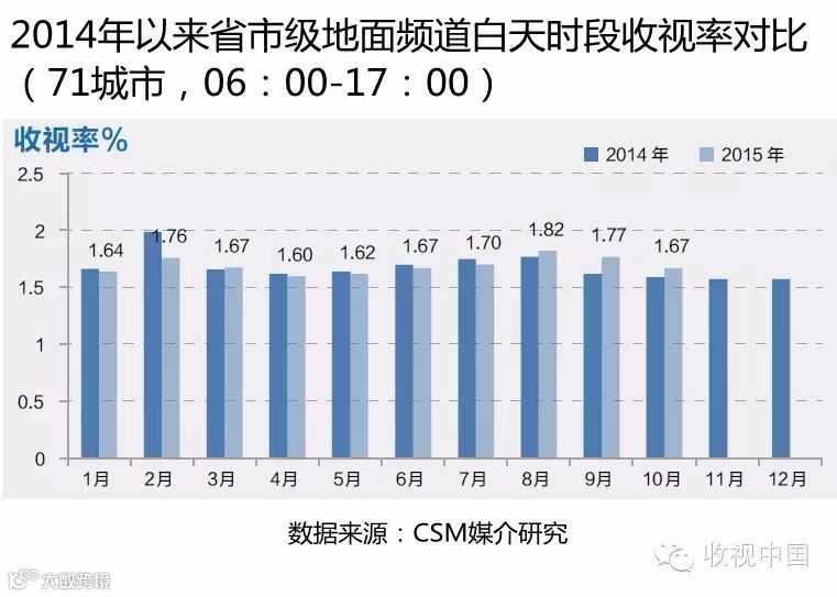 收视率同比提升后,地面频道白天时段所占的份额也接近22%,成为2015年地面频道市场份额止跌回升的重要因素。