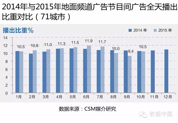 伴随着地面频道白天时段专题广告的大幅减量,省市级地面频道06:00-17:00时段的收视率在2015年9、10月份分别同比增长9%和5%。