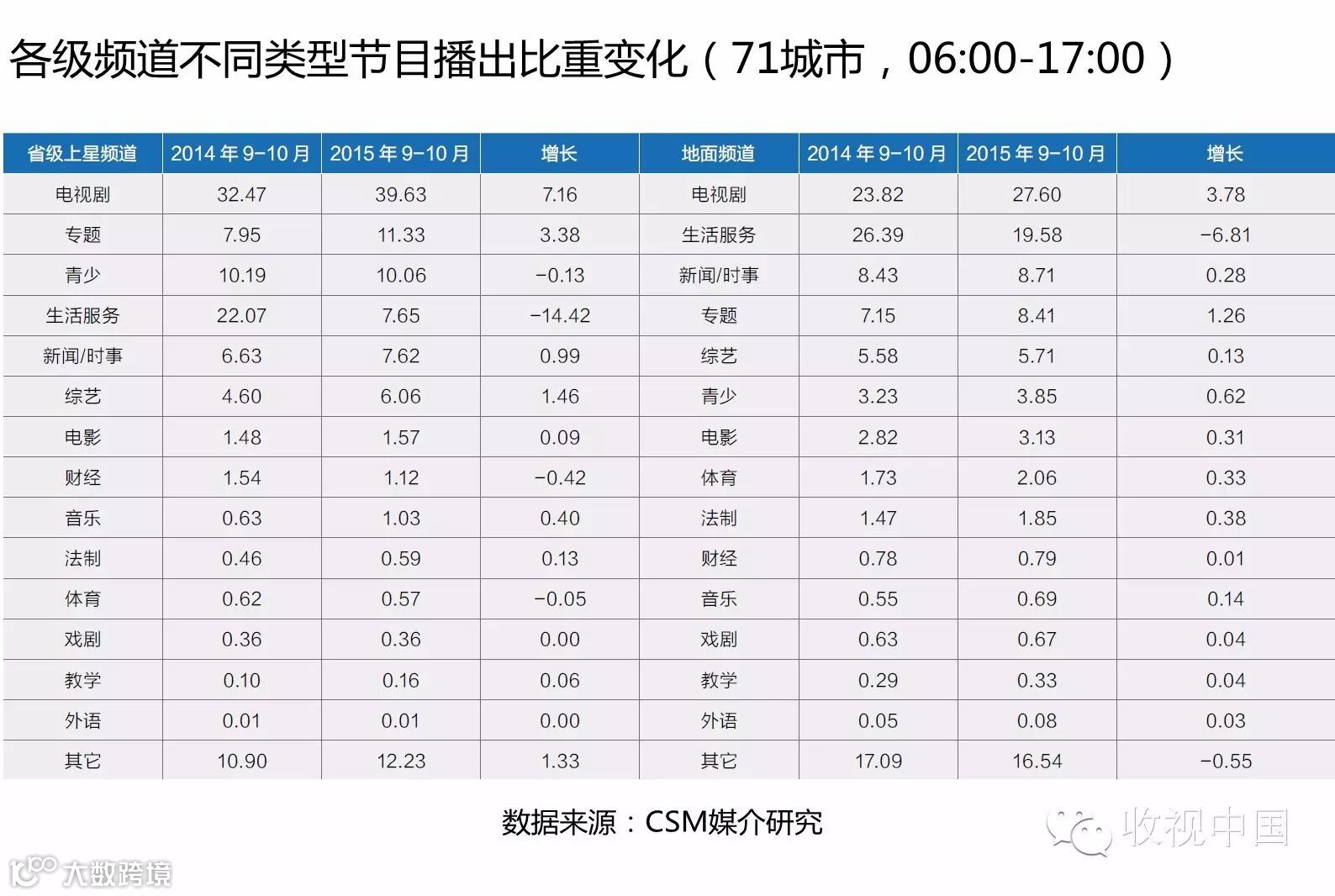 其中专题类节目的较大增长与2015年9月抗战胜利70周年纪念活动有关,广告类的增长则表明上星频道通过广告资源经营努力弥补专题广告减少的损失。