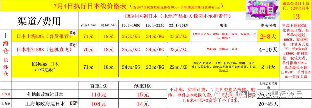 上海仓;所有线路,全球代理,线路非常广泛,不是确定走以上二个渠道的物品,建议都发我司上海仓,日本线价格表如下;