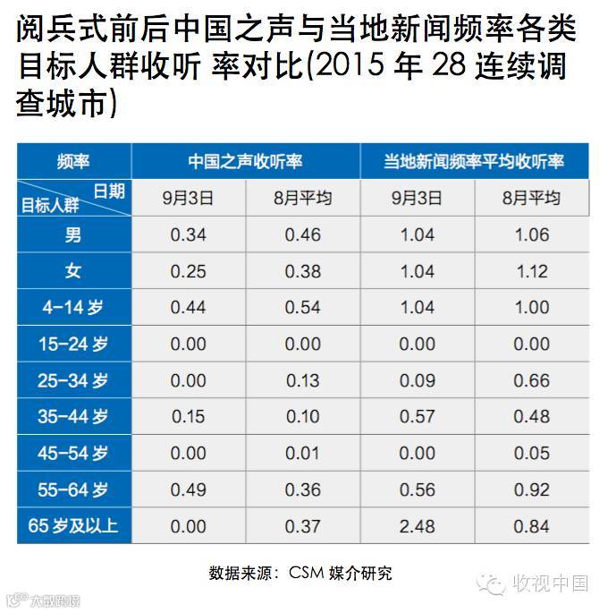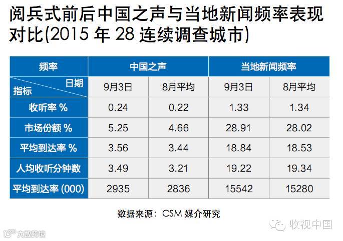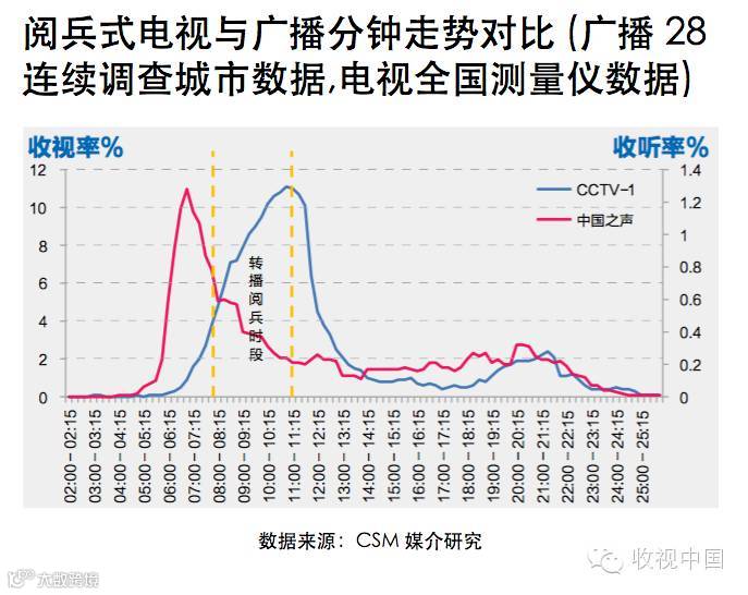 阅兵仪式直播期间,中国之声28城市收听率为0.24%,听众规模不足300万。