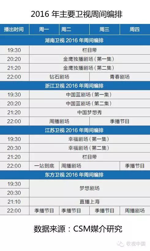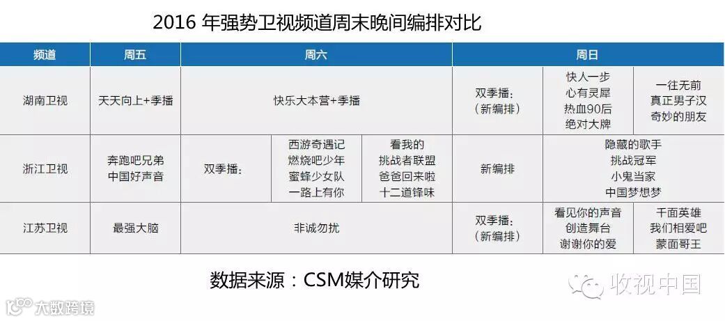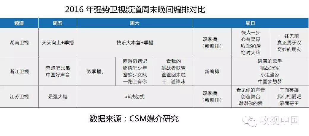 例如,从目前版面信息上看,2016年浙江卫视将继续贯彻大综艺策略,在继续投放两季《跑男》的基础上,打通周末三天晚间版面播出《蜜蜂少女队》这种或对年轻观众产生高吸引力的新节目。