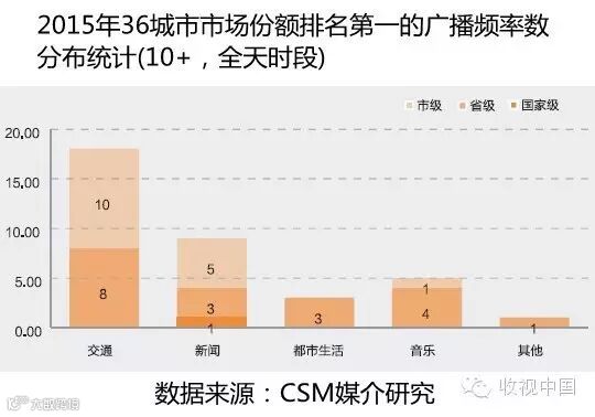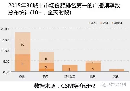 各地市场份额排名第一的多为本地广播电台的新闻综合类或交通类广播频率。在36个调查城市中,交通类广播频率领先的市场有18个,新闻综合类广播频率领先的市场有9个,音乐类广播频率领先的市场有1个,都市生活类频率领先的市场有3个。