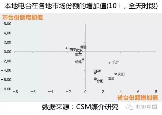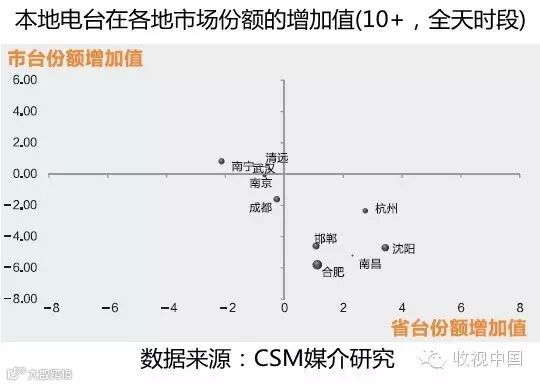 合肥、沈阳、杭州和邯郸市场的省级电台市场份额提升相对明显,而南宁、武汉和清远市场的市级电台市场份额增长明显,地方电台的竞争努力得到了市场回报。