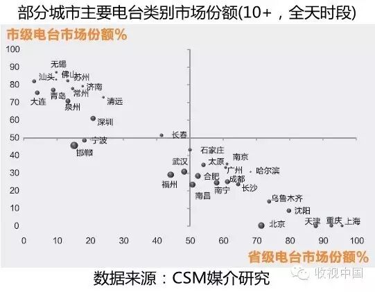 而市级电台则在无锡、佛山、苏州、汕头、济南、常州、青岛、大连、厦门、清远、泉州和深圳占有突出优势,所占市场份额超过50%;中央人民广播电台则仅在邯郸、福州、北京、南昌、武汉、合肥和南宁获得超过15%的市场份额。