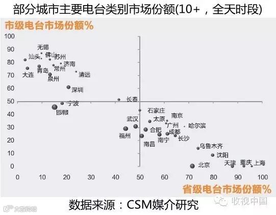 分城市来看,省级电台的竞争优势多体现于省会城市,如在沈阳、乌鲁木齐、哈尔滨、西安、杭州、长沙、成都、南京、广州、南宁、太原、合肥、南昌和石家庄,该类电台的市场份额超过了50%。