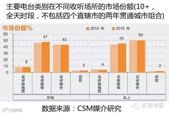 总体来看,2015年省级电台市场份额较2014年略降,但车上收听市场份额不降反升。市级电台市场份额较2014年有所提升,车上收听份额略有增加。