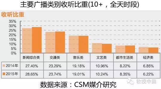 按照广播频率的名称及其播出的主要节目内容分类,2015年36城市500多个电台频率可以归类为新闻综合、交通、音乐等十个类别。新闻综合类广播频率的收听比重最高,达到28.65%,明显高于其余广播类别。