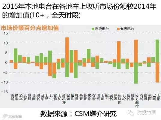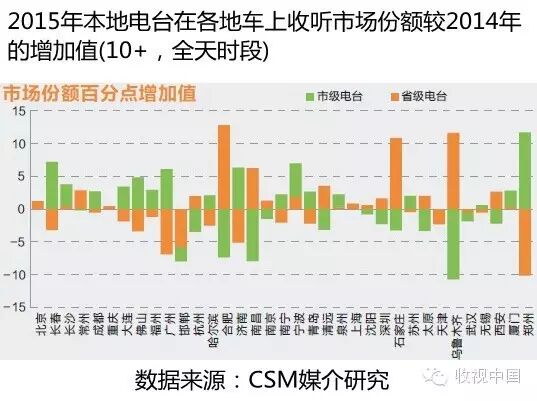 纵向数据比较显示,在非直辖市城市市场,两大本地广播电台类别的市场份额在“车上”此起彼伏的竞争最为激烈。2015年省级电台在合肥、乌鲁木齐、石家庄和南昌市场份额增长至少5个百分点。