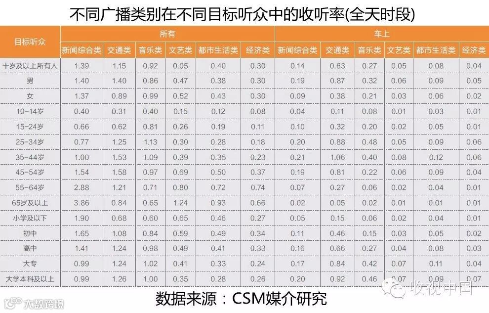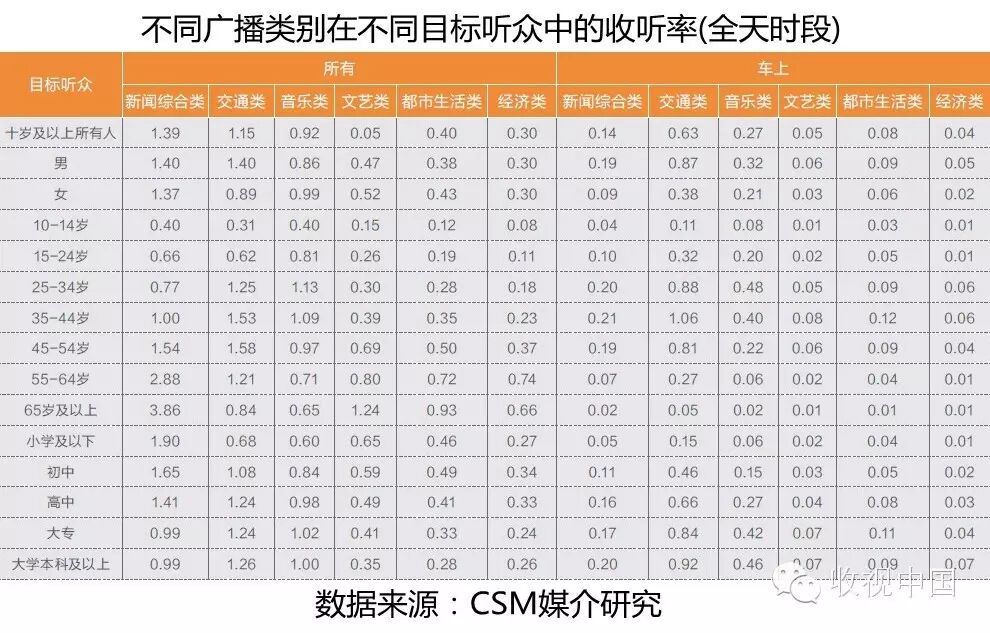 在以年龄段为细分标准的收听市场上,多数广播类别都表现出明显的年龄特征,新闻综合类、文艺类和都市生活类广播在老年听众中有较高的收听率。