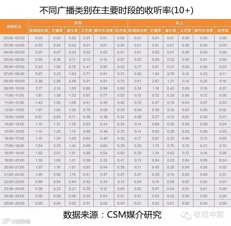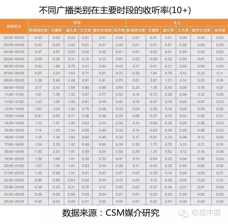 就车上收听率数据来看,交通和音乐类广播表现抢眼,交通类广播的收听高峰出现在07:00-09:00和17:00-19:00时段,音乐类广播的车上收听高峰出现在07:00-09:00和17:00-18:00时段。