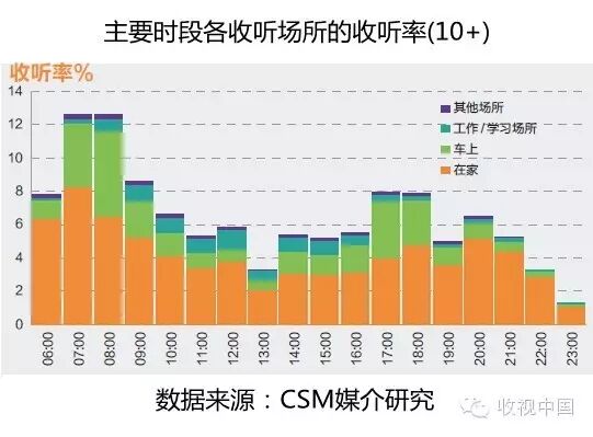 按照总体收听率走势可以划分为早间交通高峰时段、上午时段、午间时段、下午时段、晚间交通高峰时段和夜间时段。在各主要时间段,在家收听率均高于在其余所有场所的收听率。