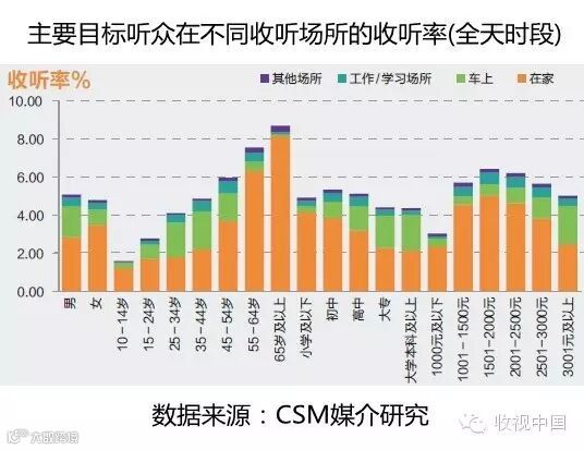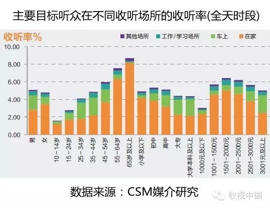 不同目标听众和不同收听场所的收听数据可以更为形象和量化地刻画广播听众特征。男性听众收听率高于女性;收听率随年龄的增长而增长;中等学历听众收听率相对较高;月平均收入1500元至2500元听众收听率较高。